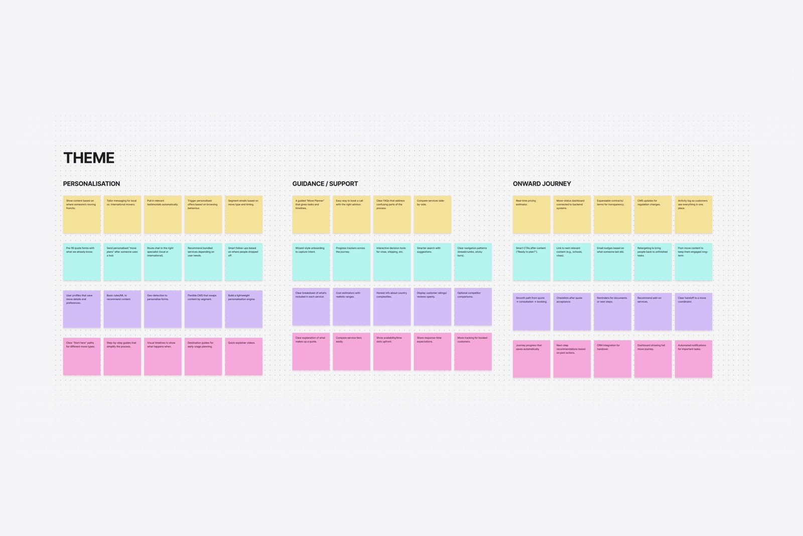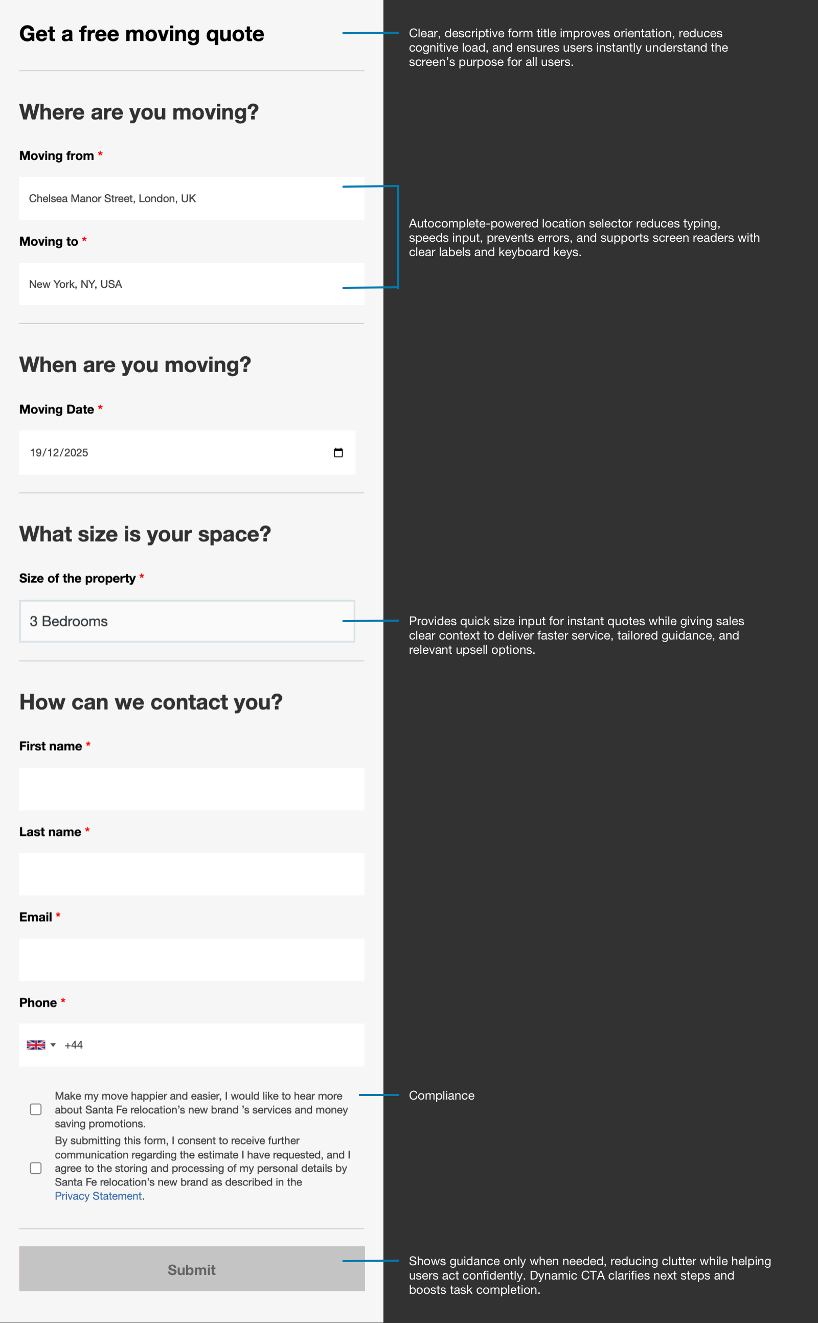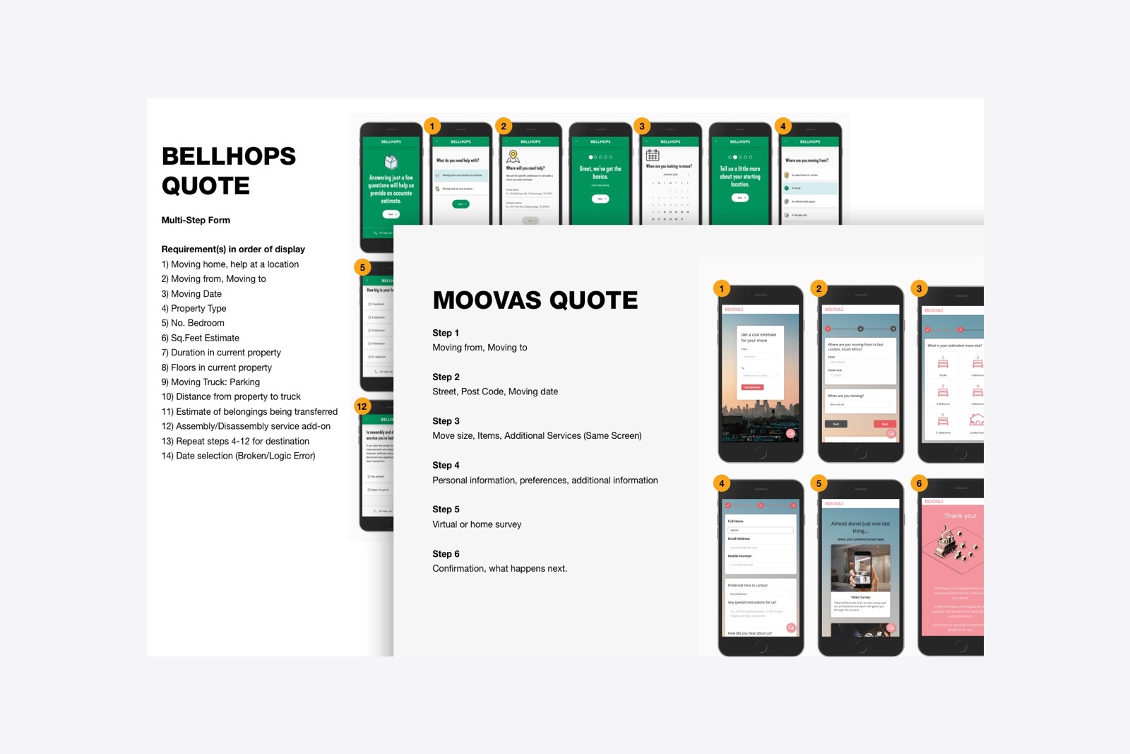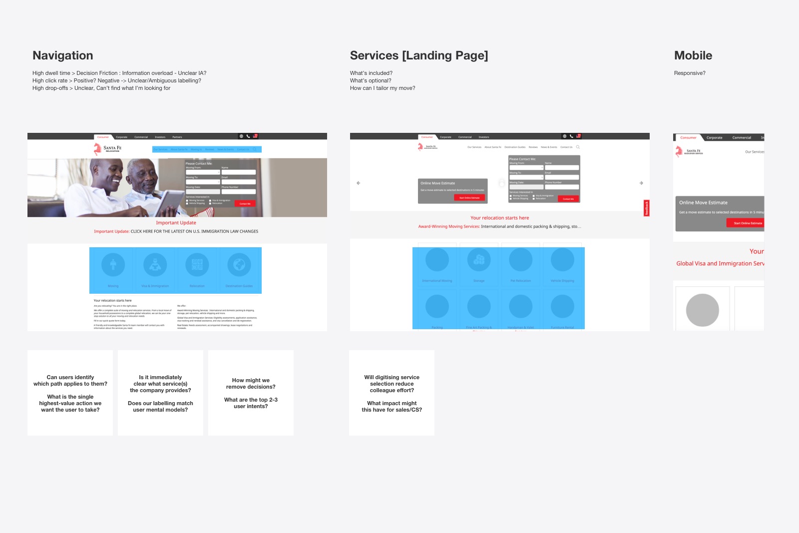 Competitor and market analysis provided essential context, highlighting industry standards and identifying opportunities to differentiate. I mapped onboarding flows, landing page, navigation labels, CTAs, form requirements, and post-lead comms against several brands ranging from premium services to small-budget moves.
